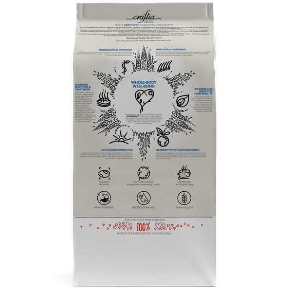 Состав: дегидратированный куриный белок*, рис*, картофель*, жир домашней птицы (курица, индейка)*, гидролизованные рыбные белки (минтай, пикша)*, дегидратированный белок лосося*, дегидратированный свиной белок *, сухое яйцо (куриное) *, ячмень*, овес*, льняное семя, масло лосося (4%) *, сухая свекольная пульпа, клетчатка гороха, монокальцийфосфат, хлорид калия, инулин цикория (0,6%), дрожжевой экстракт (источник маннанолигосахаридов) (0,6%), фруктоолигосахариды (0,4%), карбонат кальция, хлорид натрия, аскофиллум узловатый (Ascophyllum Nodosum), сухие пивные дрожжи, сушёное яблоко, сушеный фенхель, сушеная мята, семена и шелуха подорожника, юкка Шидигера. *Легкоусвояемые ингредиенты.